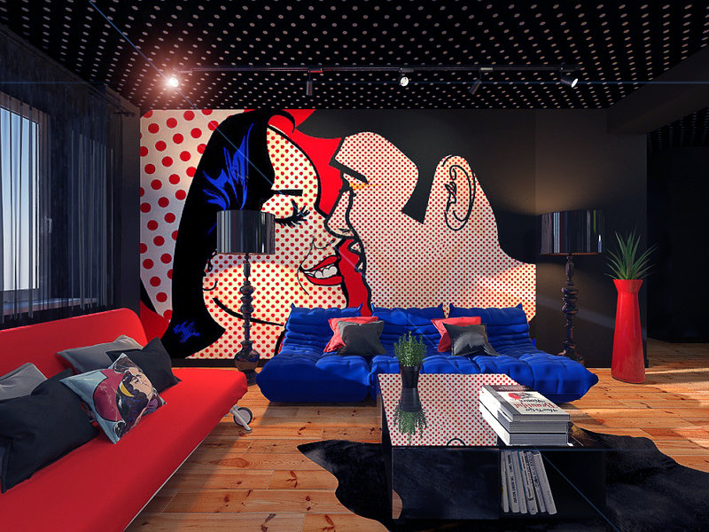 5) Декор. Отлично впишутся в помещение посты, афиши, картины, фото в стиле поп арт , персонажи из комиксов. Их можно разместить просто на стенах, а можно заказать печать на подушках. Прекрасно будут смотреться предметы, имеющие декоративное значение и временную функциональность. Например, бутылку из-под вина используйте вместо вазы, установите раскладные стулья, поставьте бескаркасную мебель, пр.