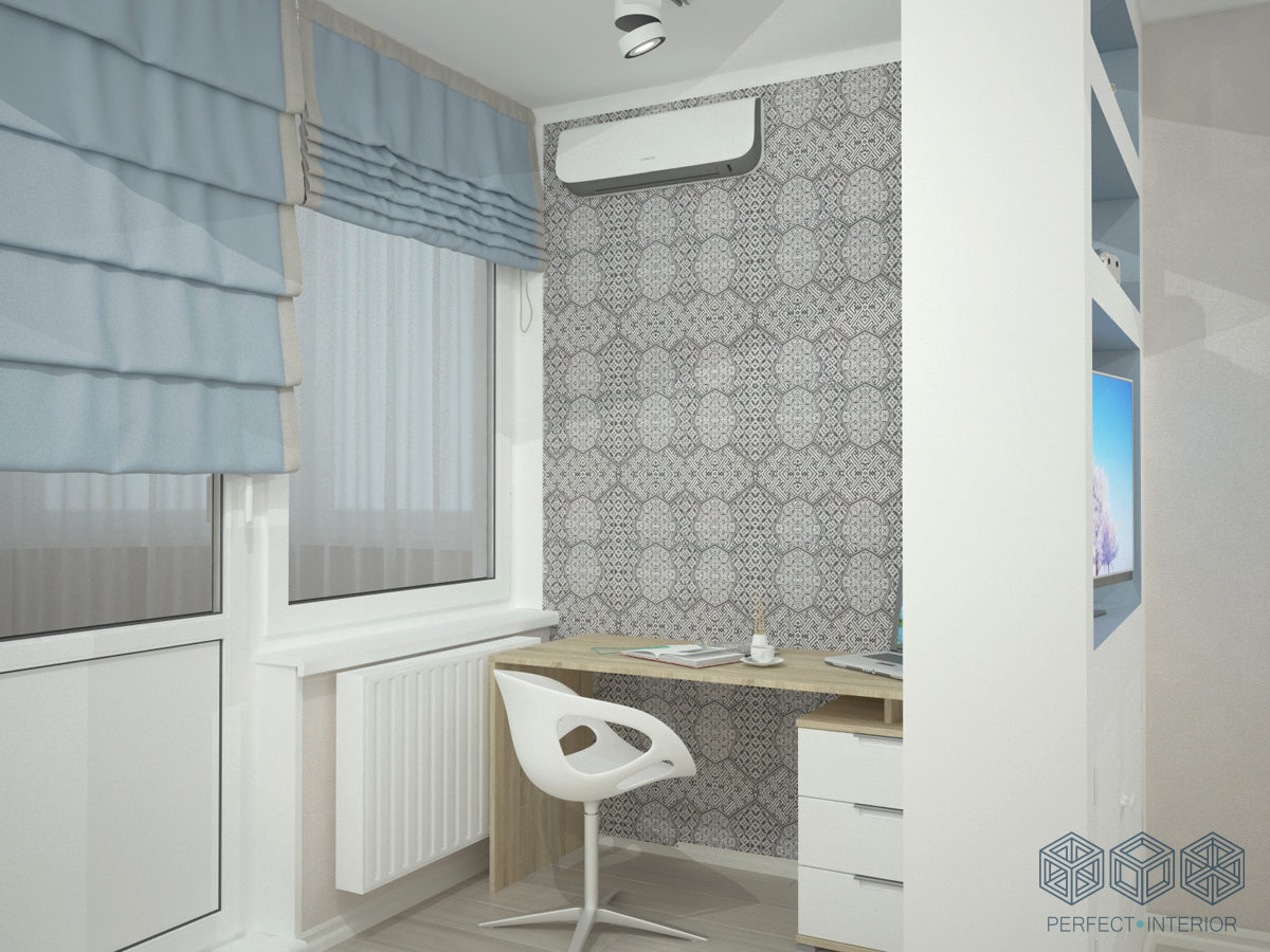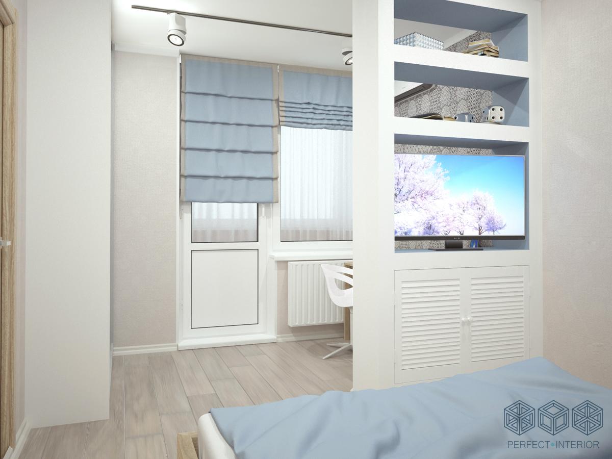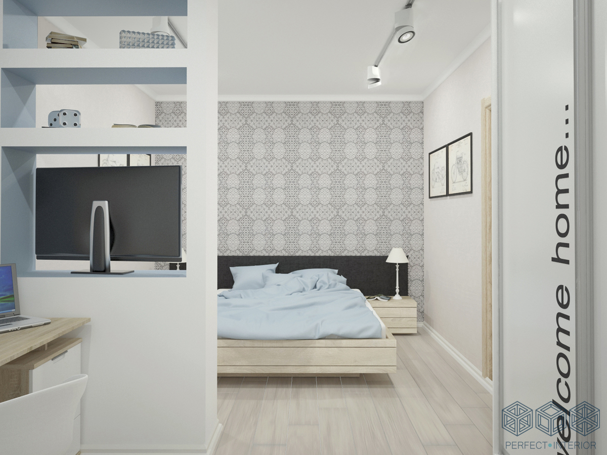 The bedroom is conditionally divided by a partition into 2 zones – working and sleeping. The partition is not only a decorative element, but also carries a functional charge – it has a niche under the TV, shelves and a locker with swing doors. The main decorative element of the bedroom is a Scandinavian black and white ornament. It decorates the wall behind the bed and the wall at the desk.