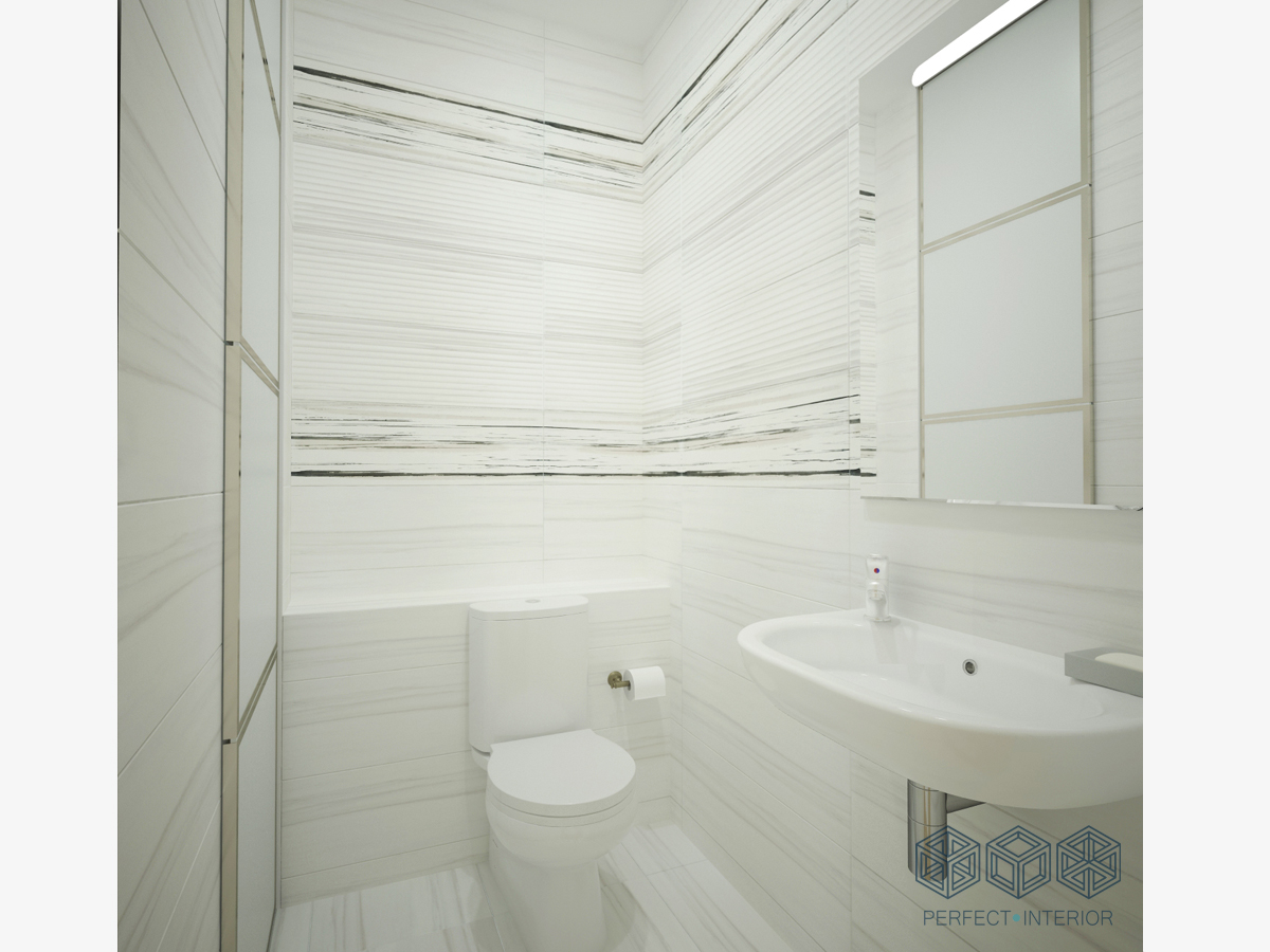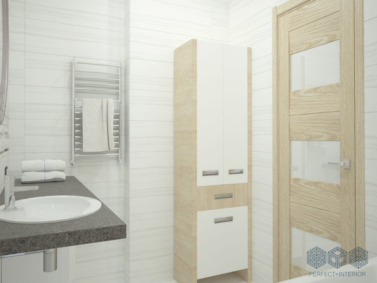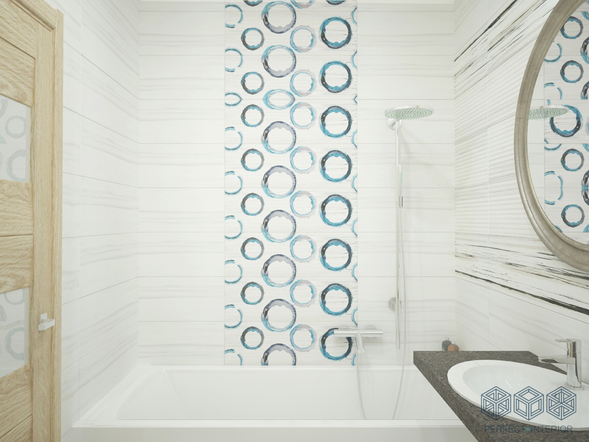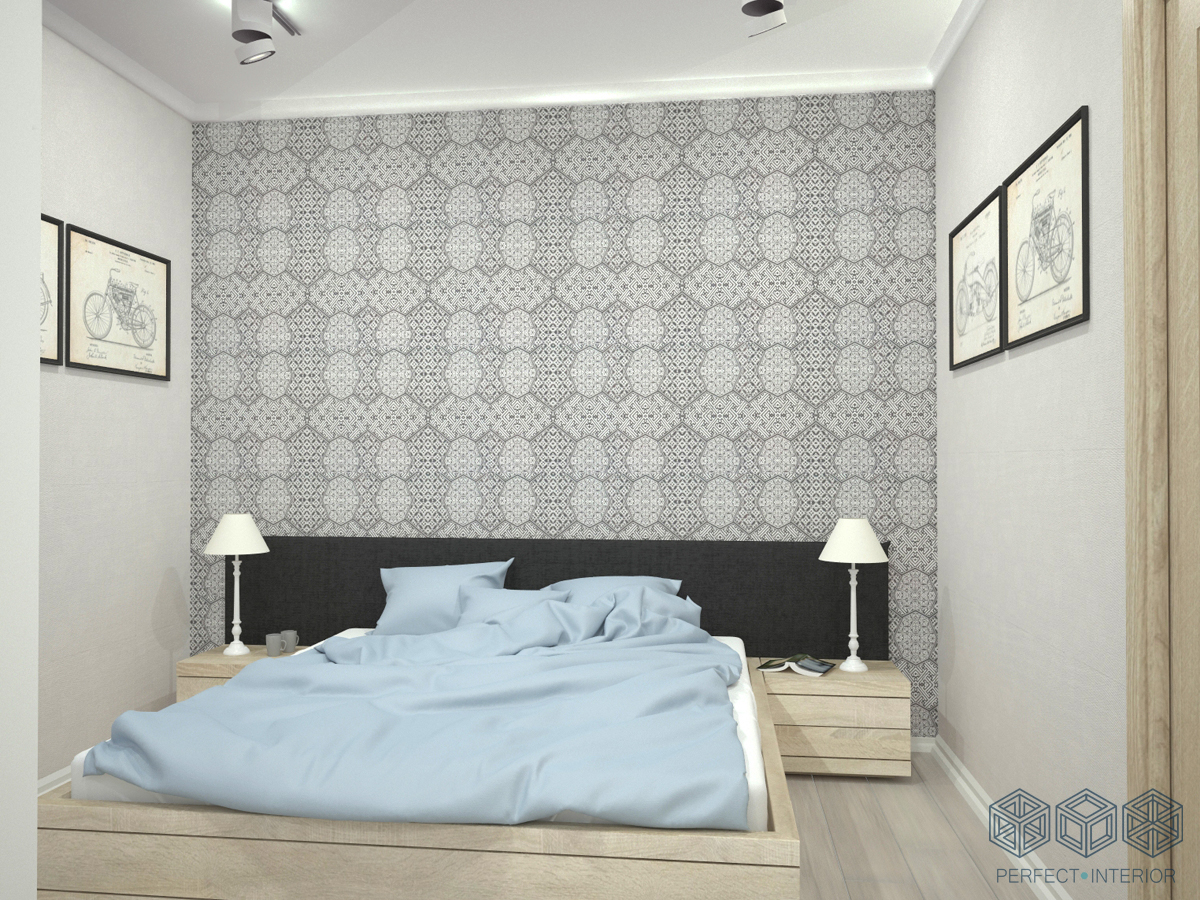 The bedroom is conditionally divided by a partition into 2 zones – working and sleeping. The partition is not only a decorative element, but also carries a functional charge – it has a niche under the TV, shelves and a locker with swing doors. The main decorative element of the bedroom is a Scandinavian black and white ornament. It decorates the wall behind the bed and the wall at the desk.