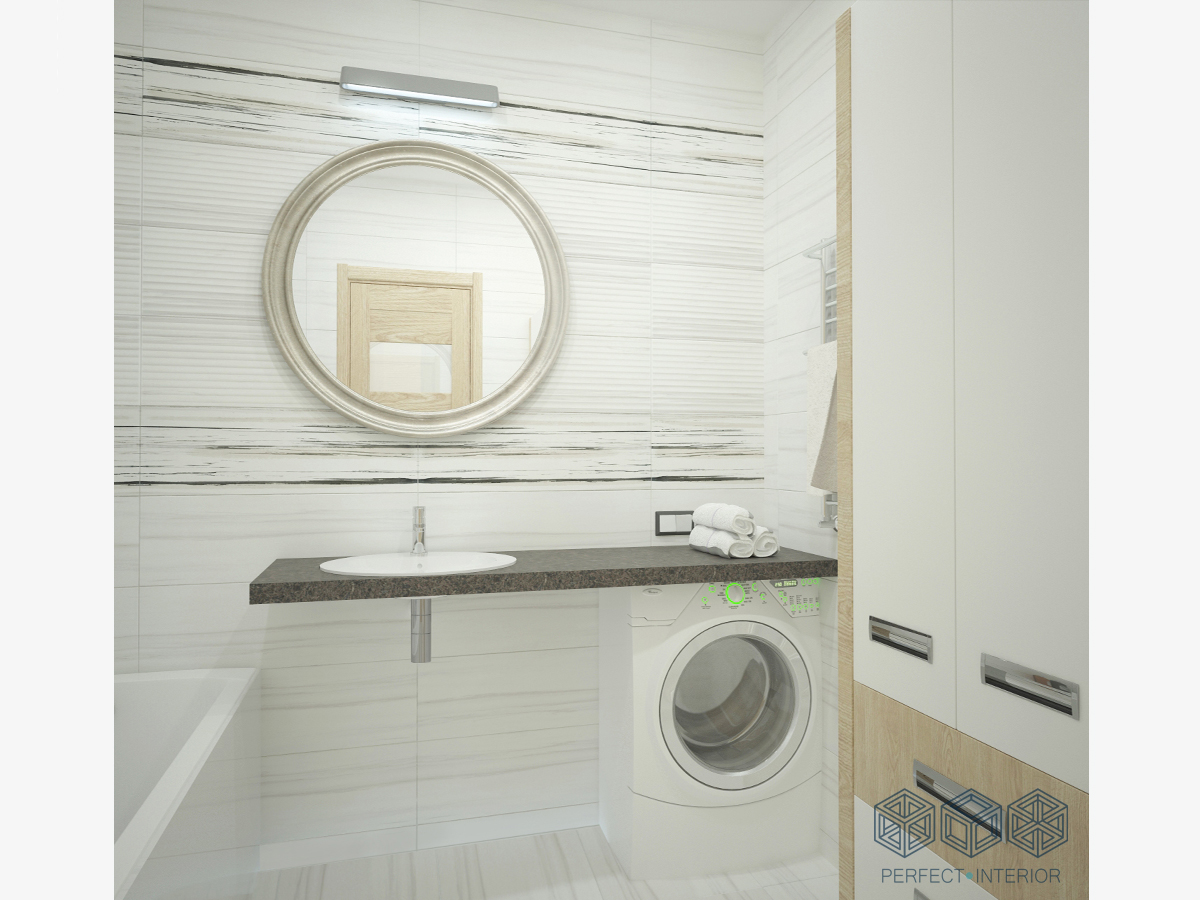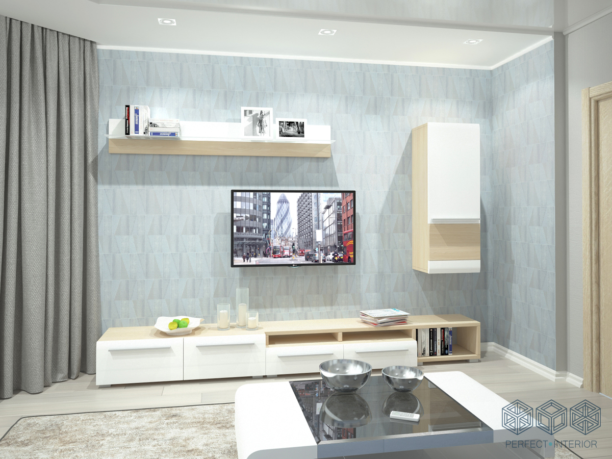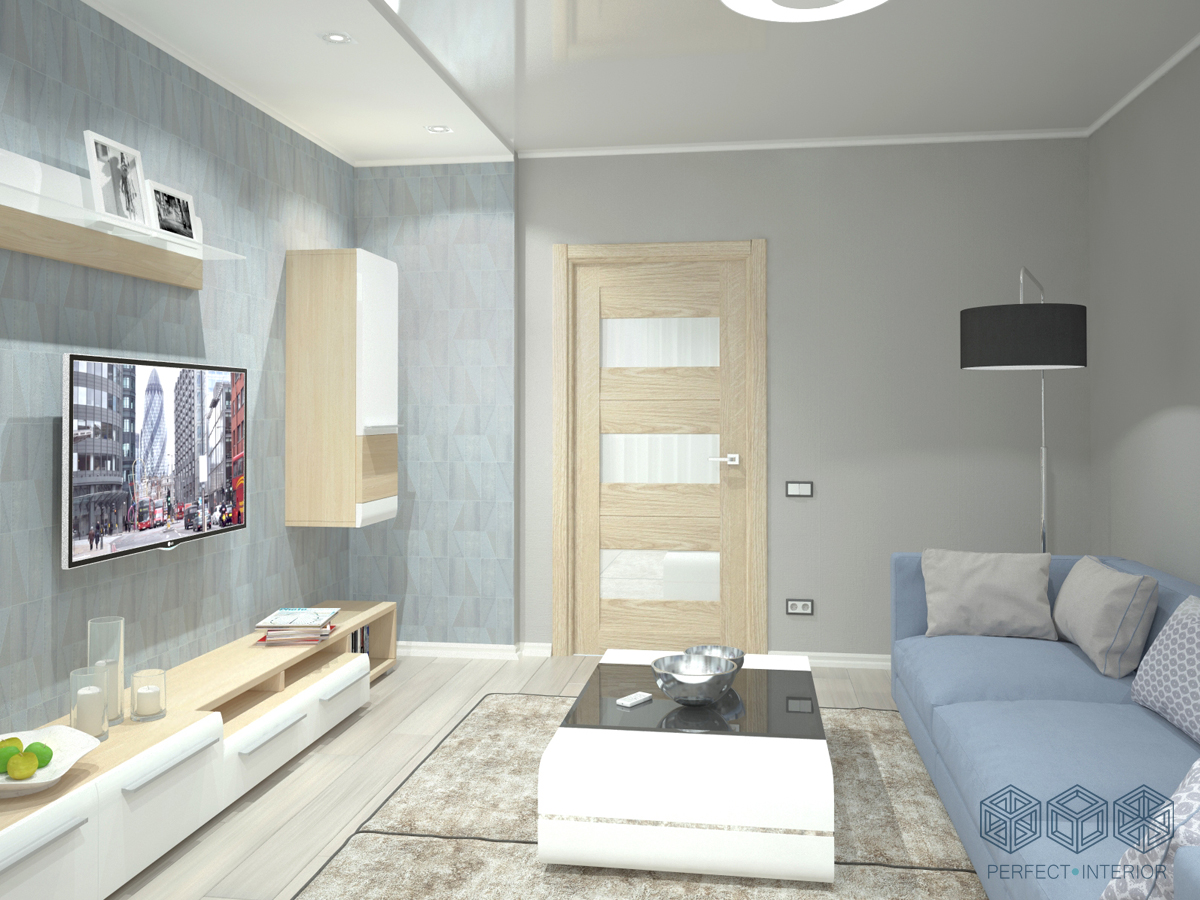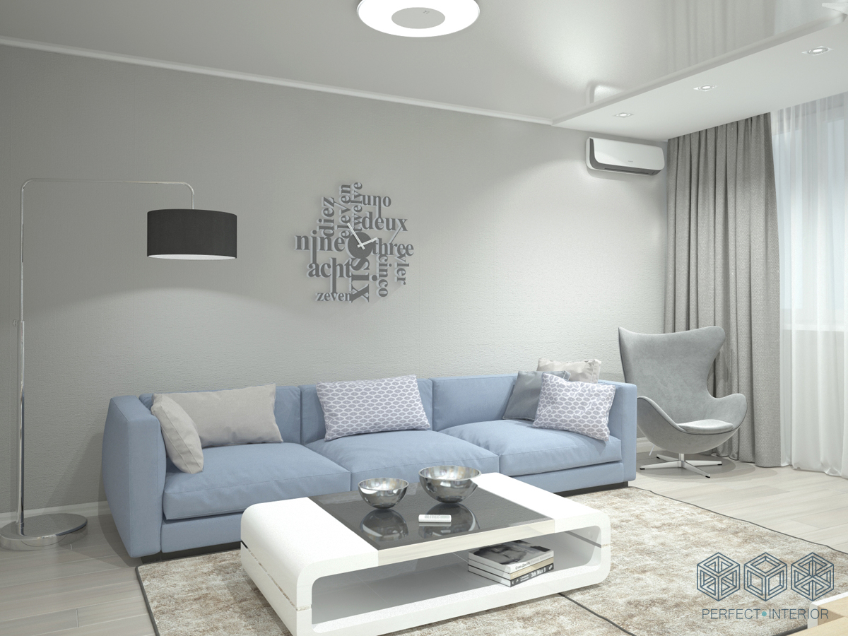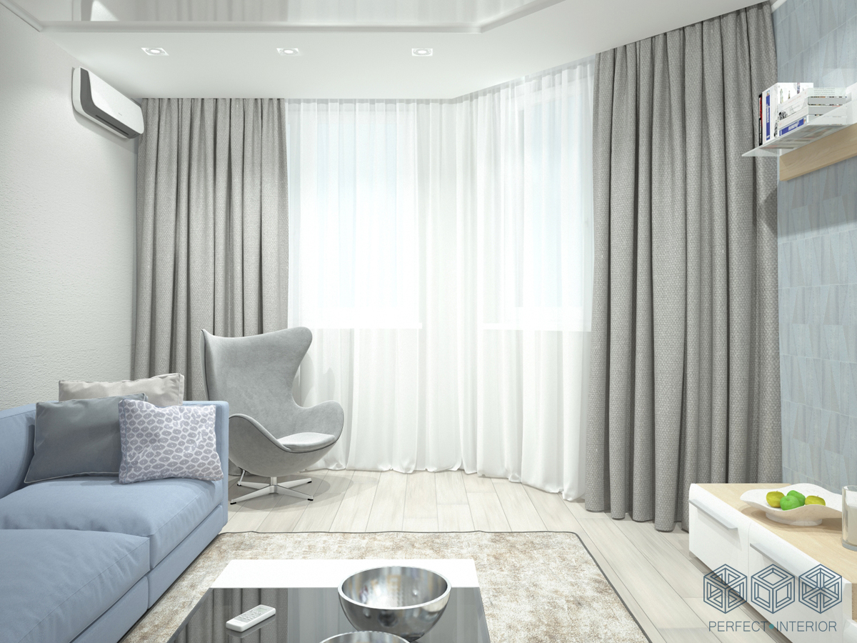 The living room space is very different from the “sterile” white interiors advertised in magazines. Full of energy and color the room at every step emphasizes the individuality of its inhabitants. Here the snow-white is perfectly combined with the natural shades of the tree with complex pastel blue tones and neutral gray. Laconic Scandinavian sofa and cozy chair Egg organize a recreation area and are a composition center for the interior. The furniture for TV is compact and multifunctional.
