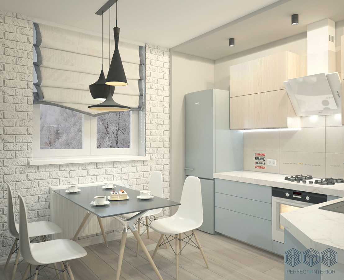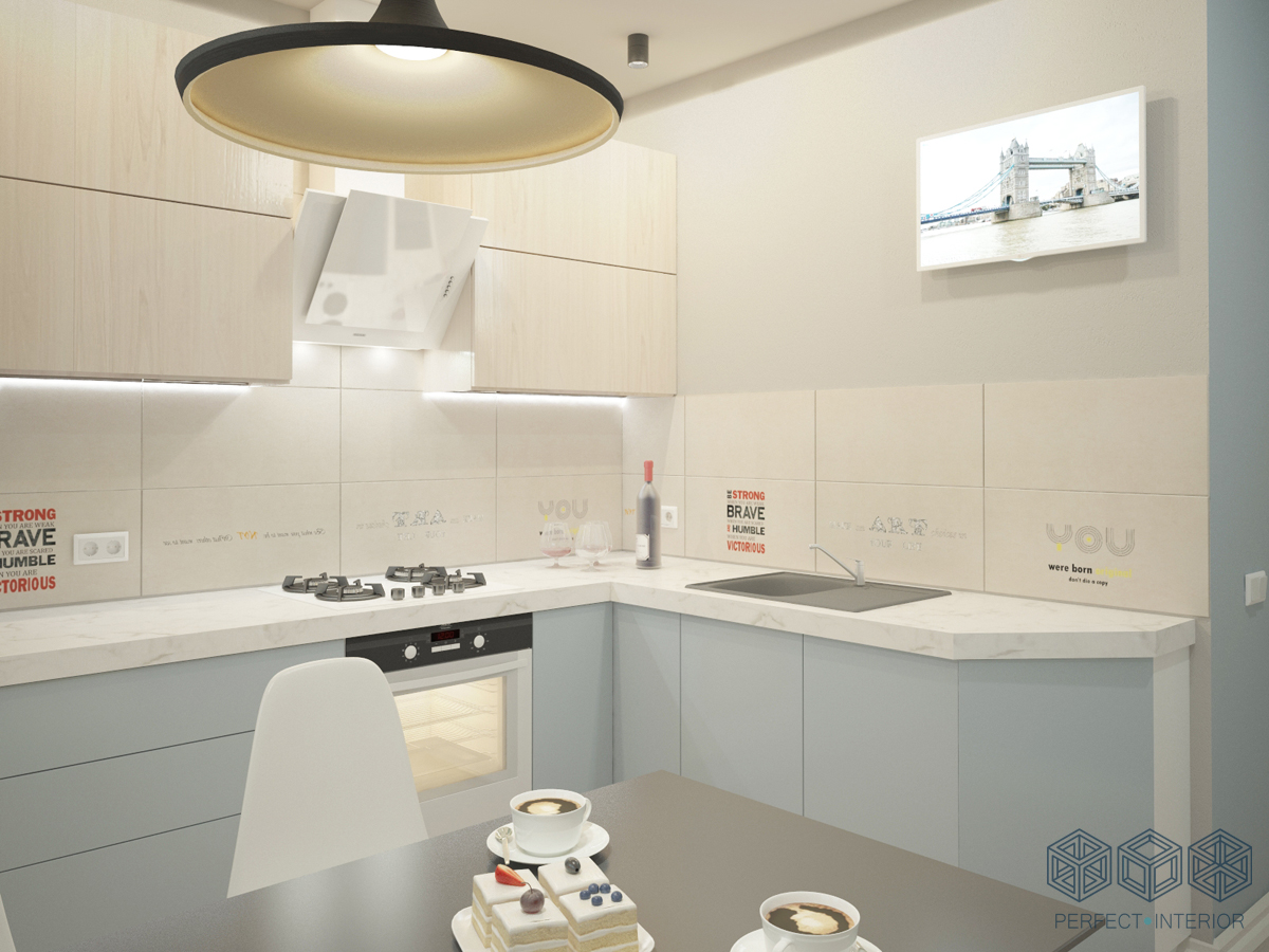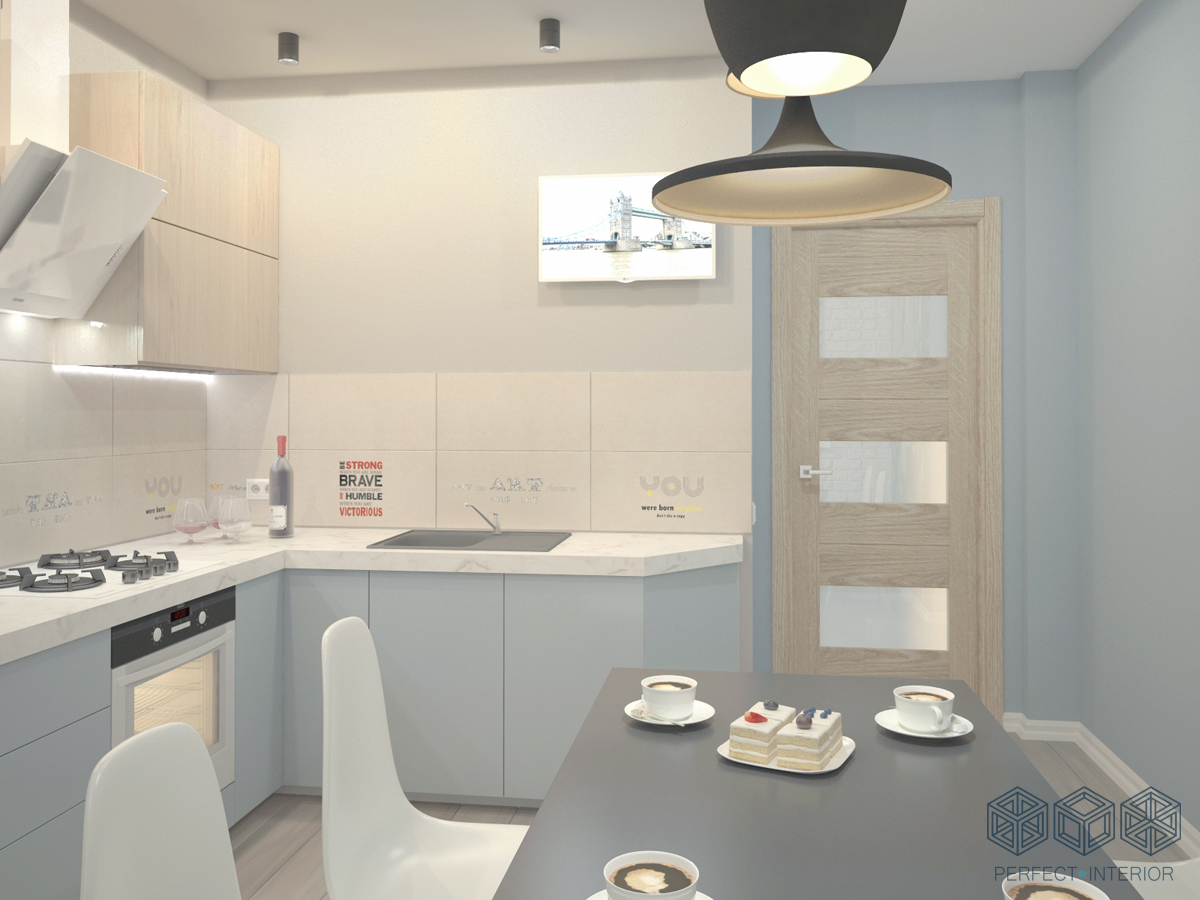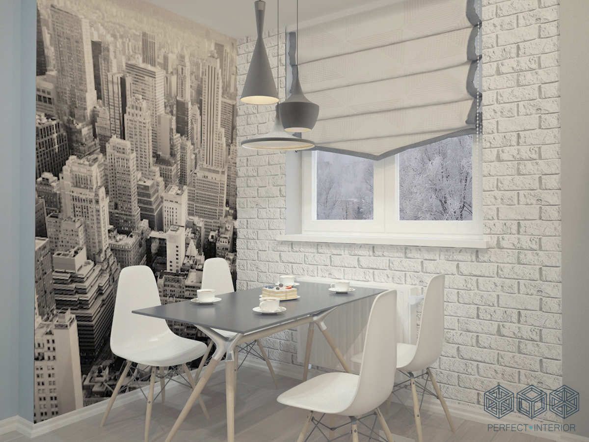 The kitchen looks impressive, but at the same time homey cozy. The main wall is decorated with a graphical panorama of the city and is effectively combined with a white brick wall. Kitchen facades of the muffled blue shade are perfectly supplemented with facades from light wood.