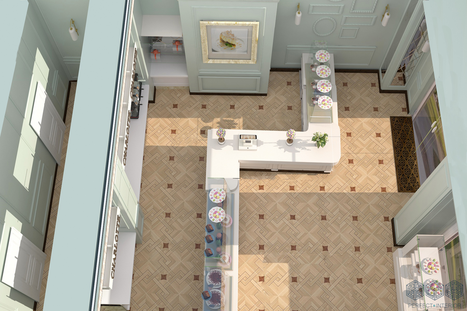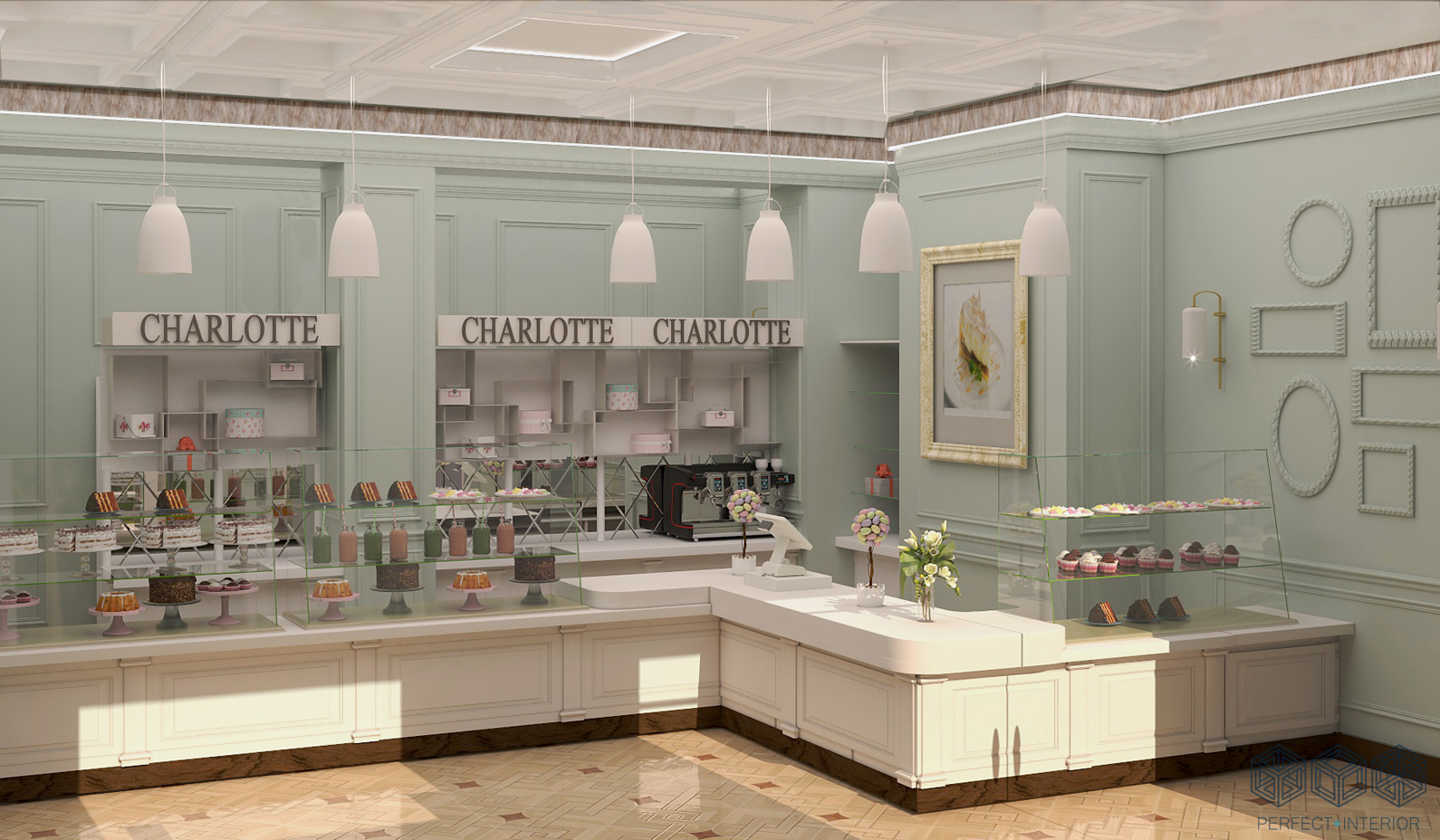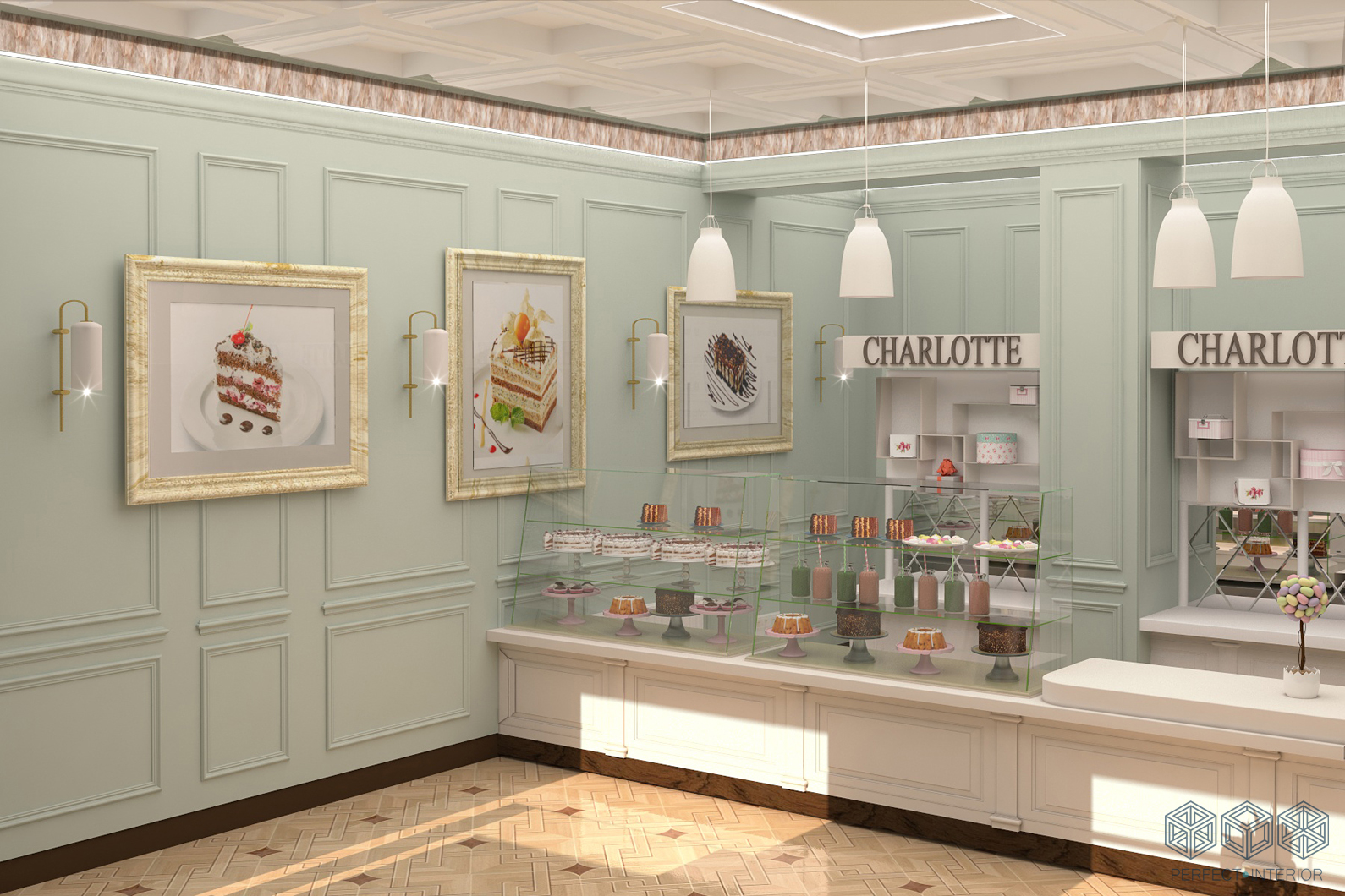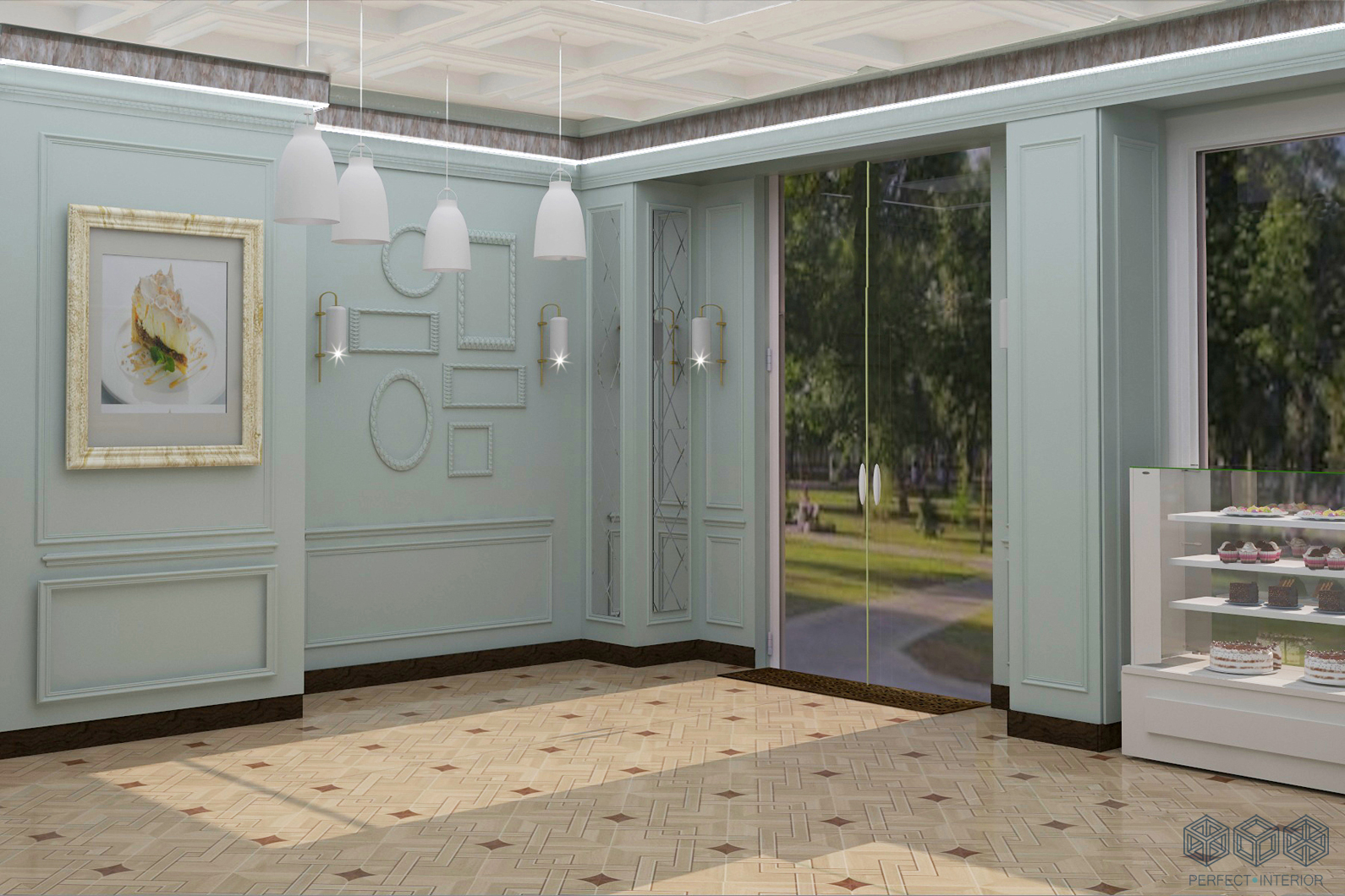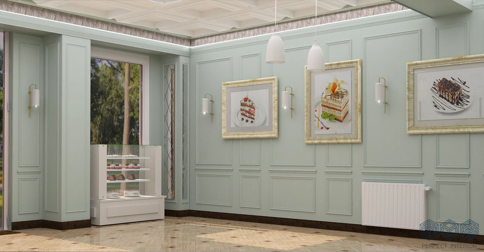 В ходе работы для отделки потолков были использованы кессоны. На полу износостойкая плитка природных оттенков. Визуальная доминанта – стеклянная витрина с пирожными. Искусственно состаренная мебель вносит английский шарм в стилистику помещения. В проекте имеется и основное освещение, и вспомогательное. В качестве декора использованы лепные рамки. Яркими акцентами стали фотоработы в качестве картин на стене. В результате мы получили целостный, спокойный ( за счет пастельных тонов) интерьер, который точно станет раем для сладкоежек.
