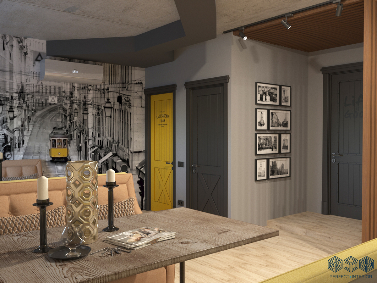 Ретро тематика городского пейзажа придает кафе домашний уют. А желтую дверь в санузел не перепутать ни с какой другой.