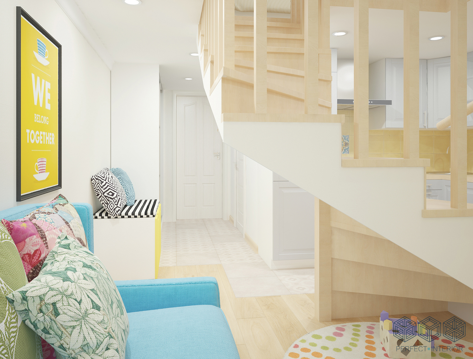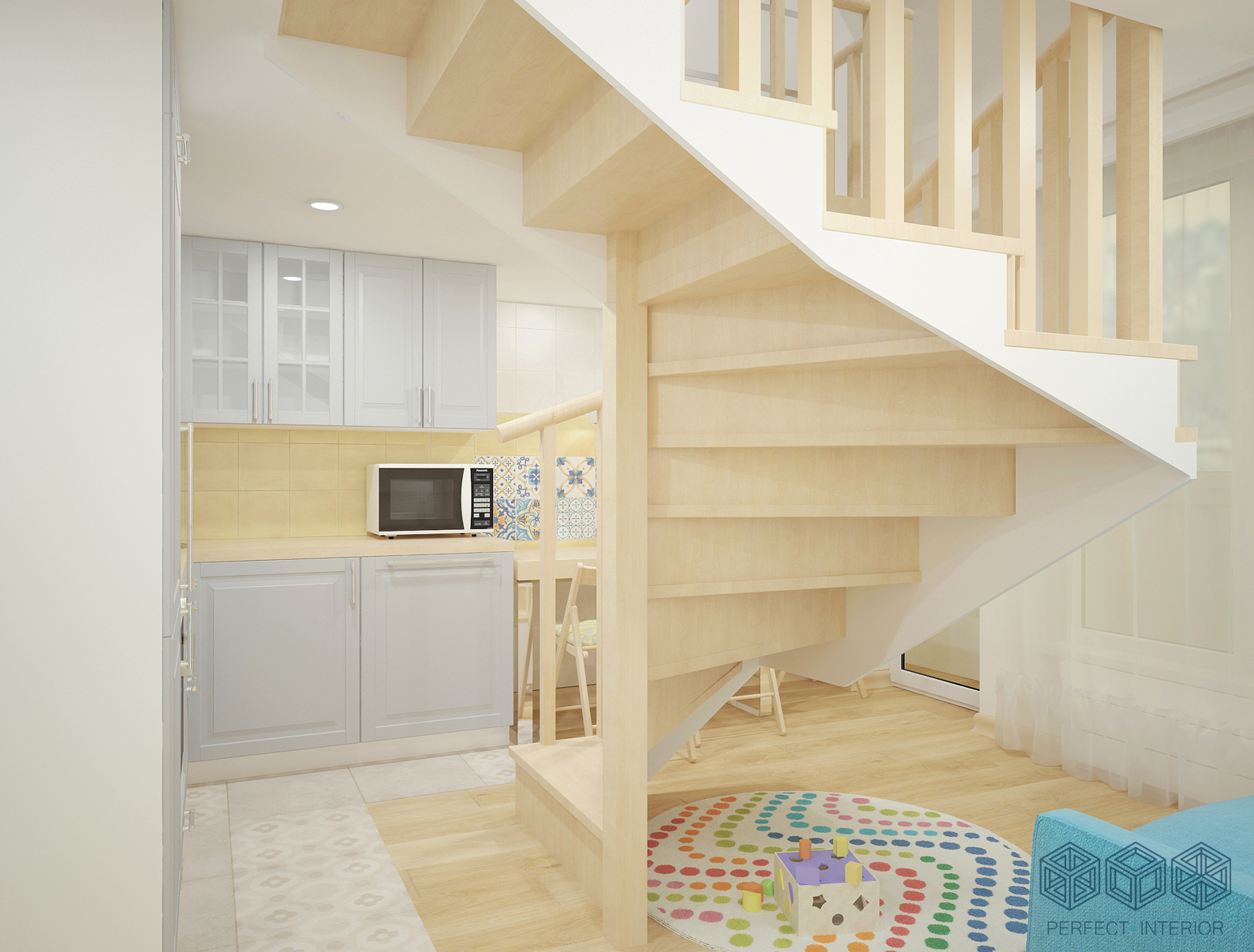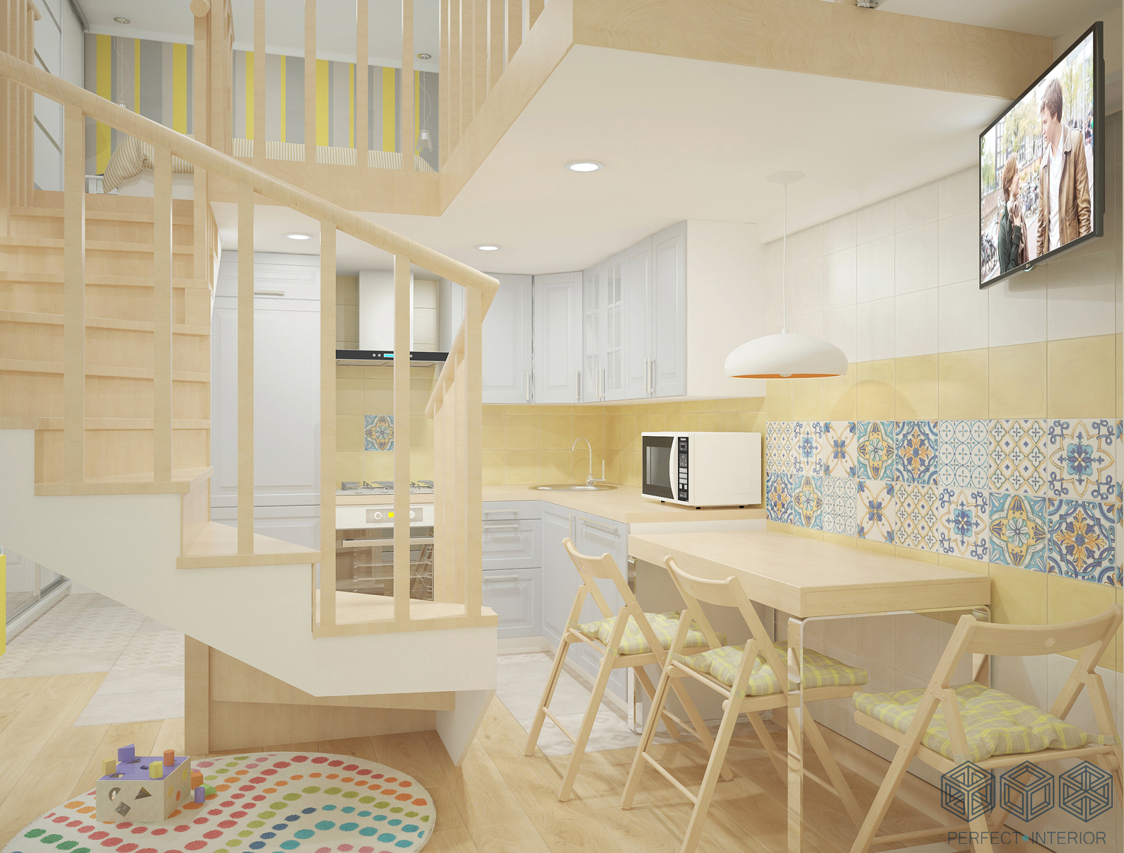 Помещение очень маленькое, но грамотная планировка помогла разместить все необходимое. На первом этаже – санузел, достаточно вместительная кухня, обеденный стол, раскладной диванчик и даже местечко для детских игр на круглом коврике. Все, что нужно для молодой семьи! А яркие и жизнерадостные цветовые акценты на светлом фоне будут поднимать хозяевам настроение каждый день.