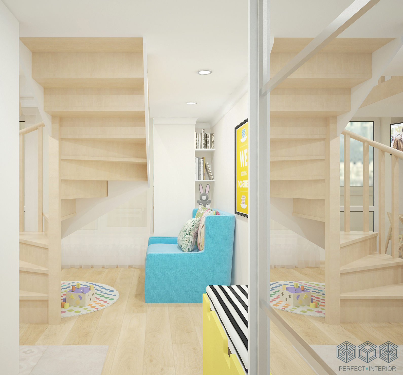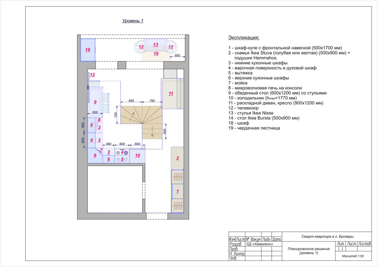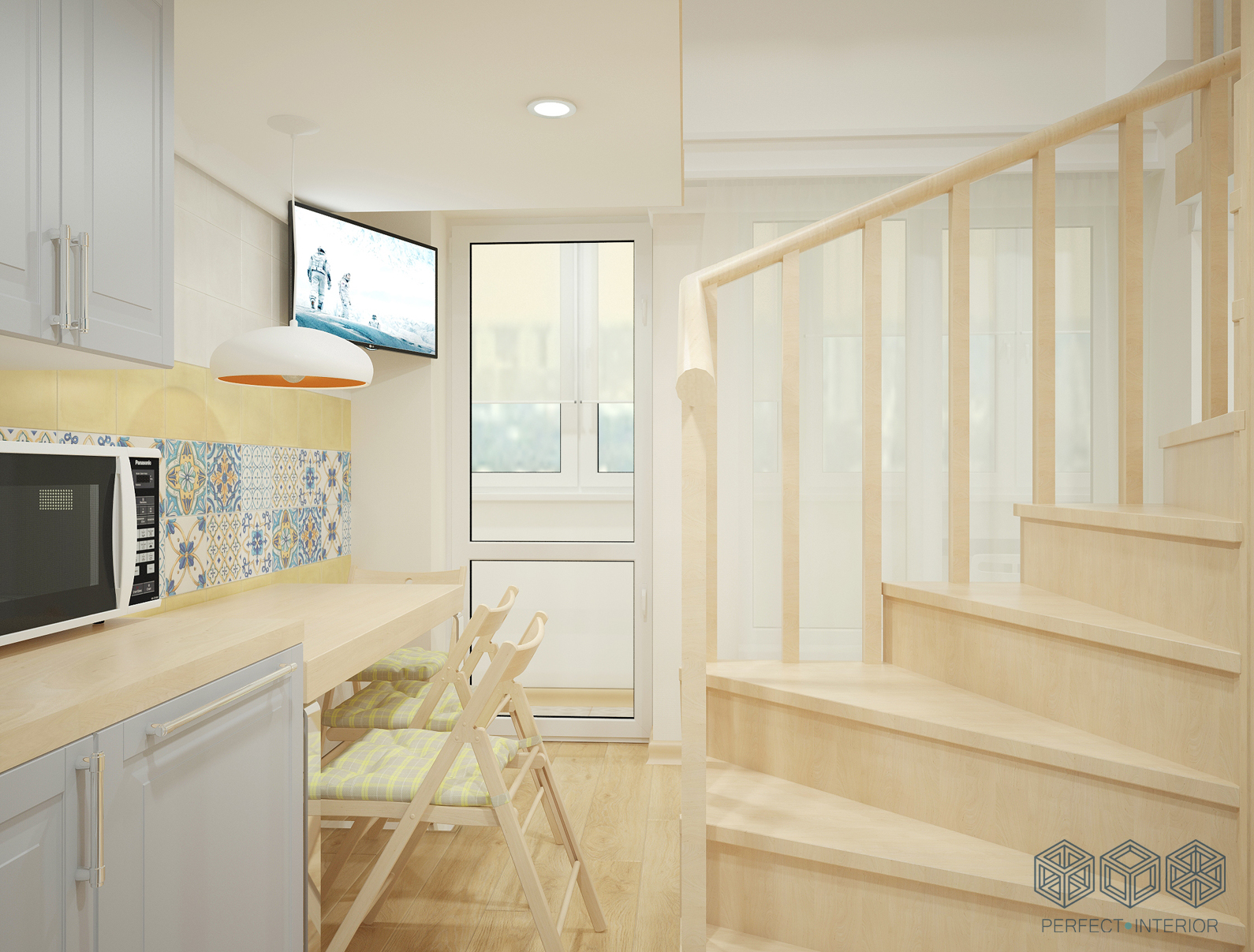 Помещение очень маленькое, но грамотная планировка помогла разместить все необходимое. На первом этаже – санузел, достаточно вместительная кухня, обеденный стол, раскладной диванчик и даже местечко для детских игр на круглом коврике. Все, что нужно для молодой семьи! А яркие и жизнерадостные цветовые акценты на светлом фоне будут поднимать хозяевам настроение каждый день.