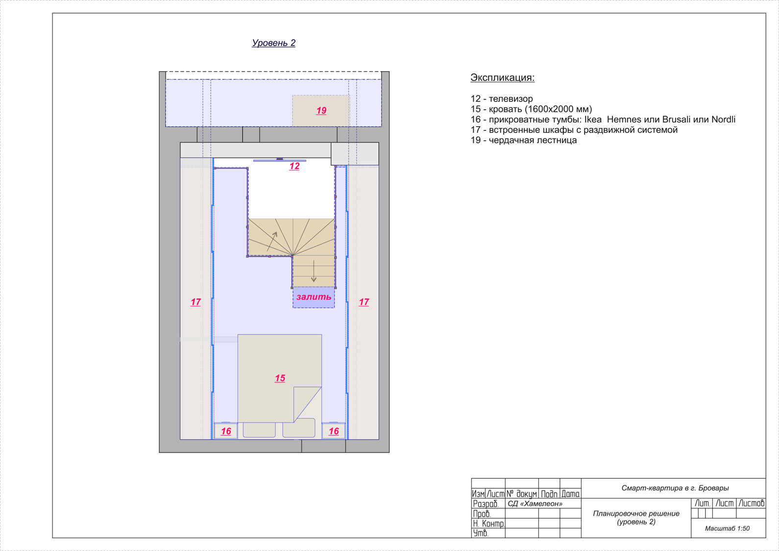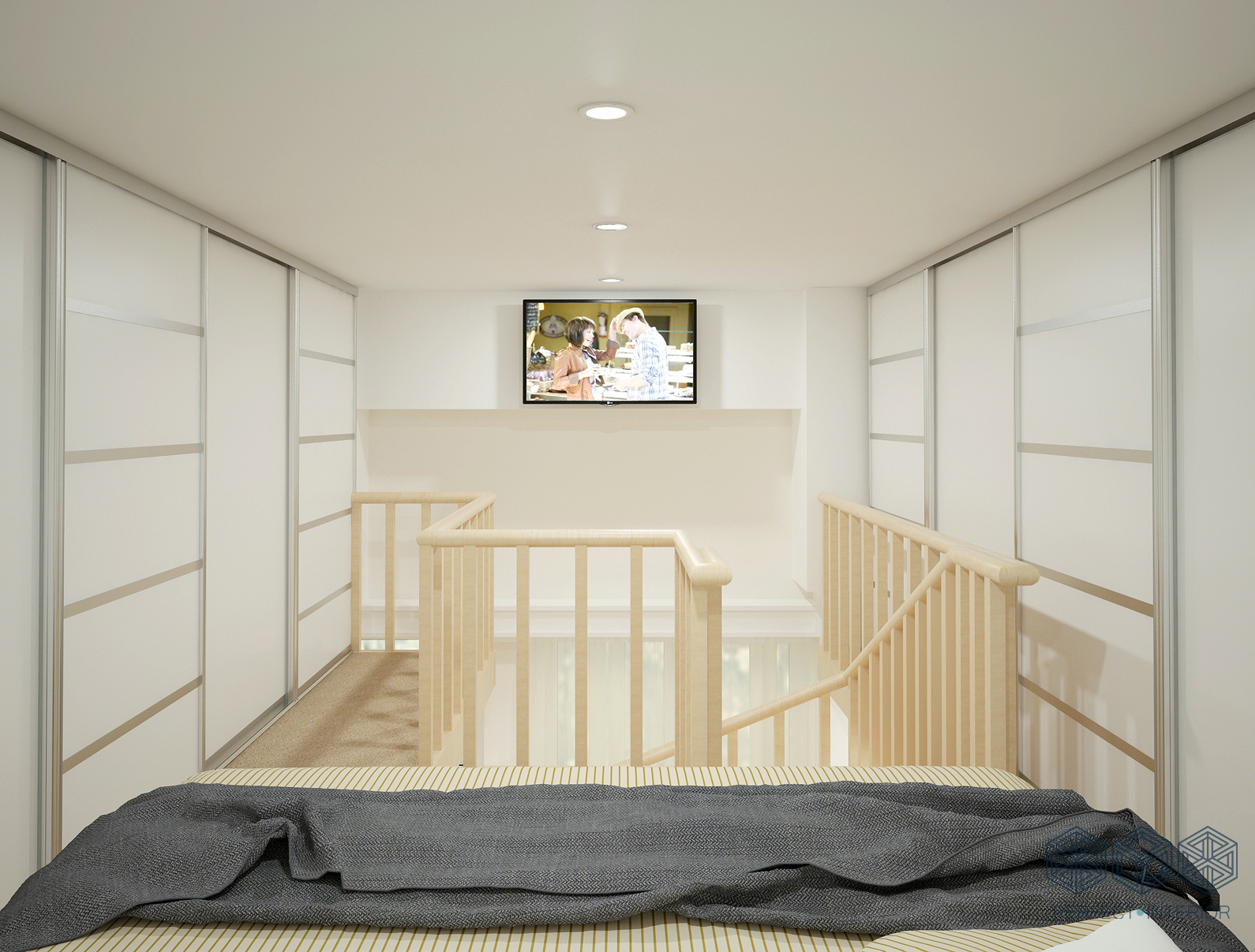 Благодаря высоким 4-ех метровым потолкам получилось организовать отдельную спальню на 2-ом этаже. Гардеробные системы разместились вдоль длинных стен спальни.